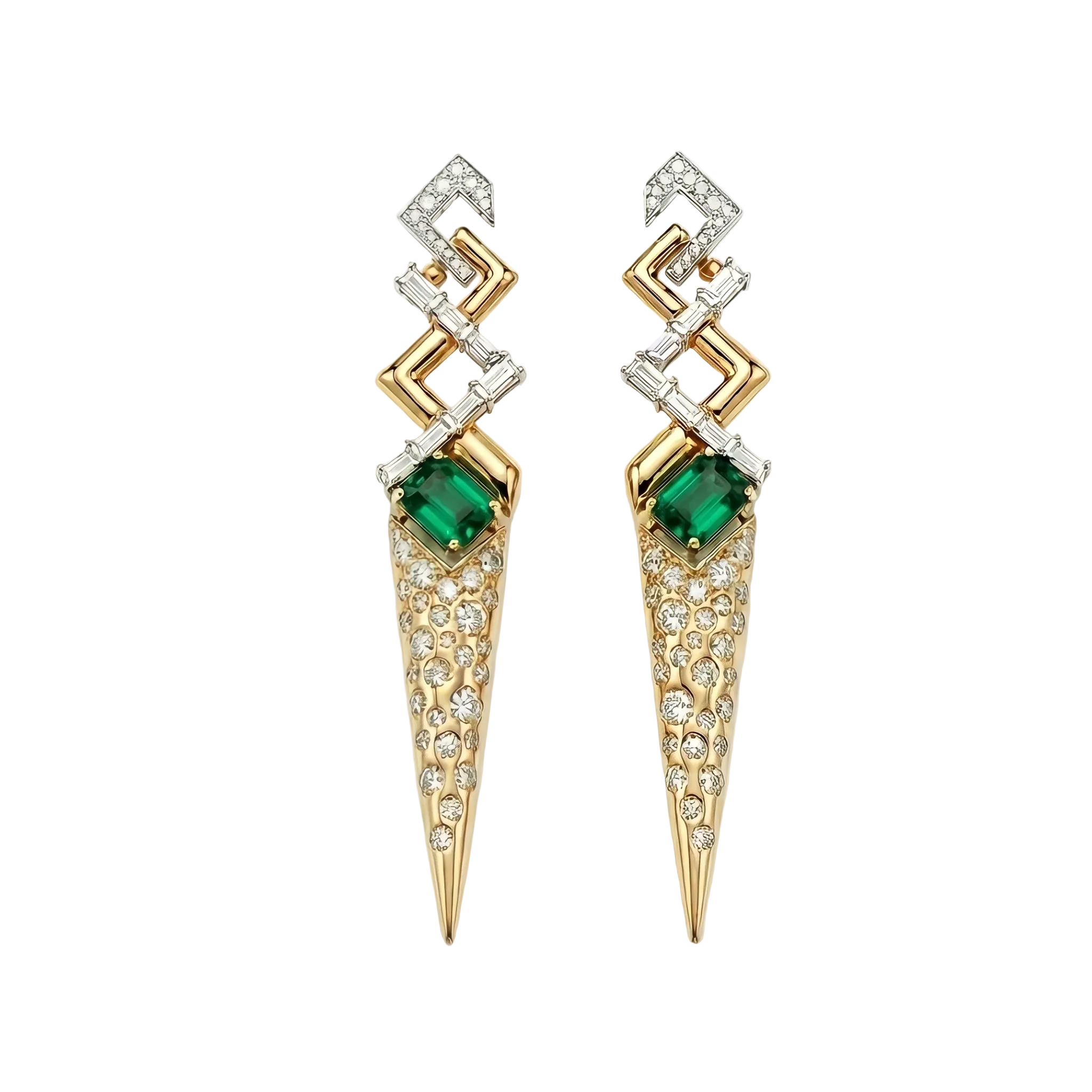 The Kinetic Spikes earrings embody the aesthetic of architectural sophistication, merging the sharp geometry of yellow gold vectors with the mystical depth of natural emeralds.