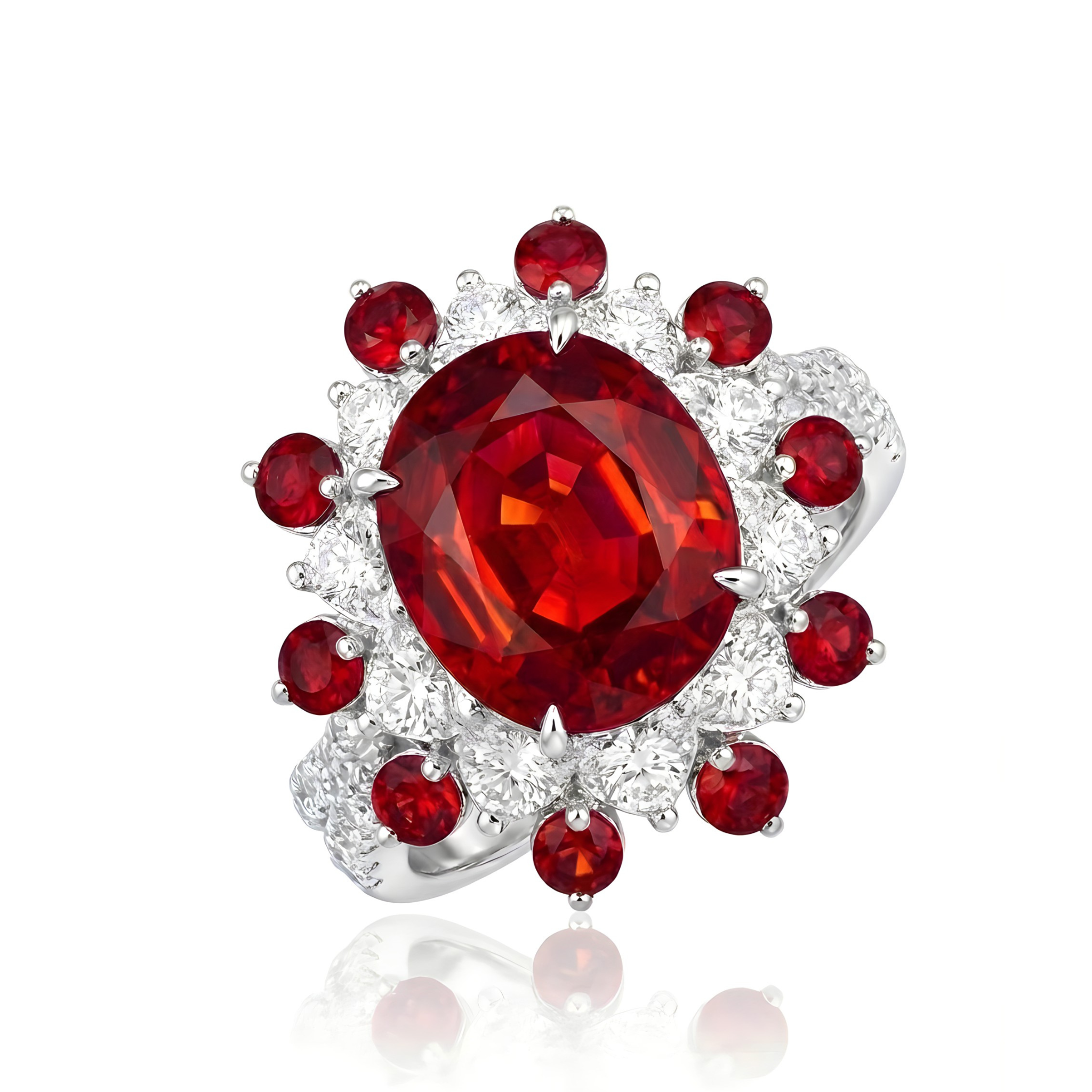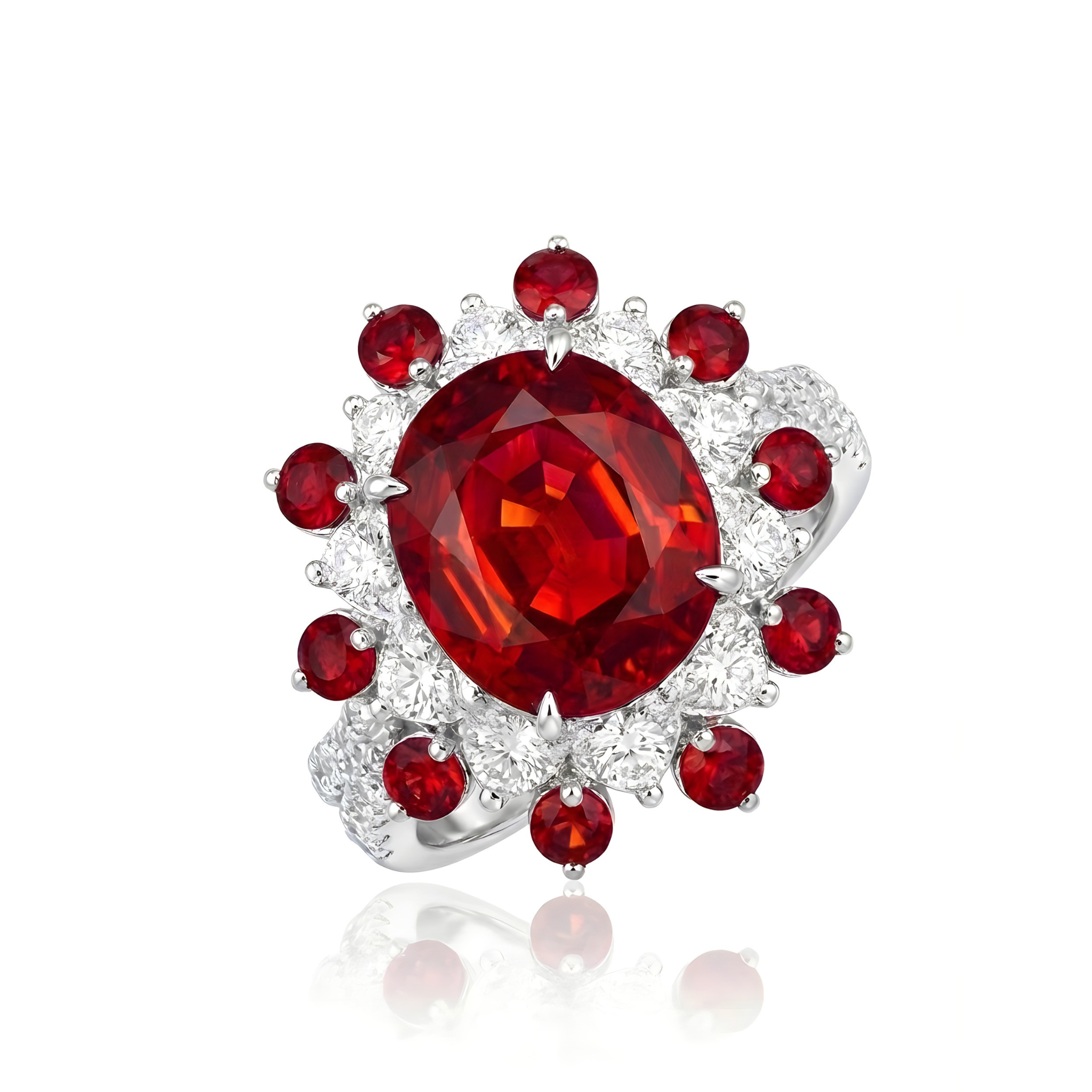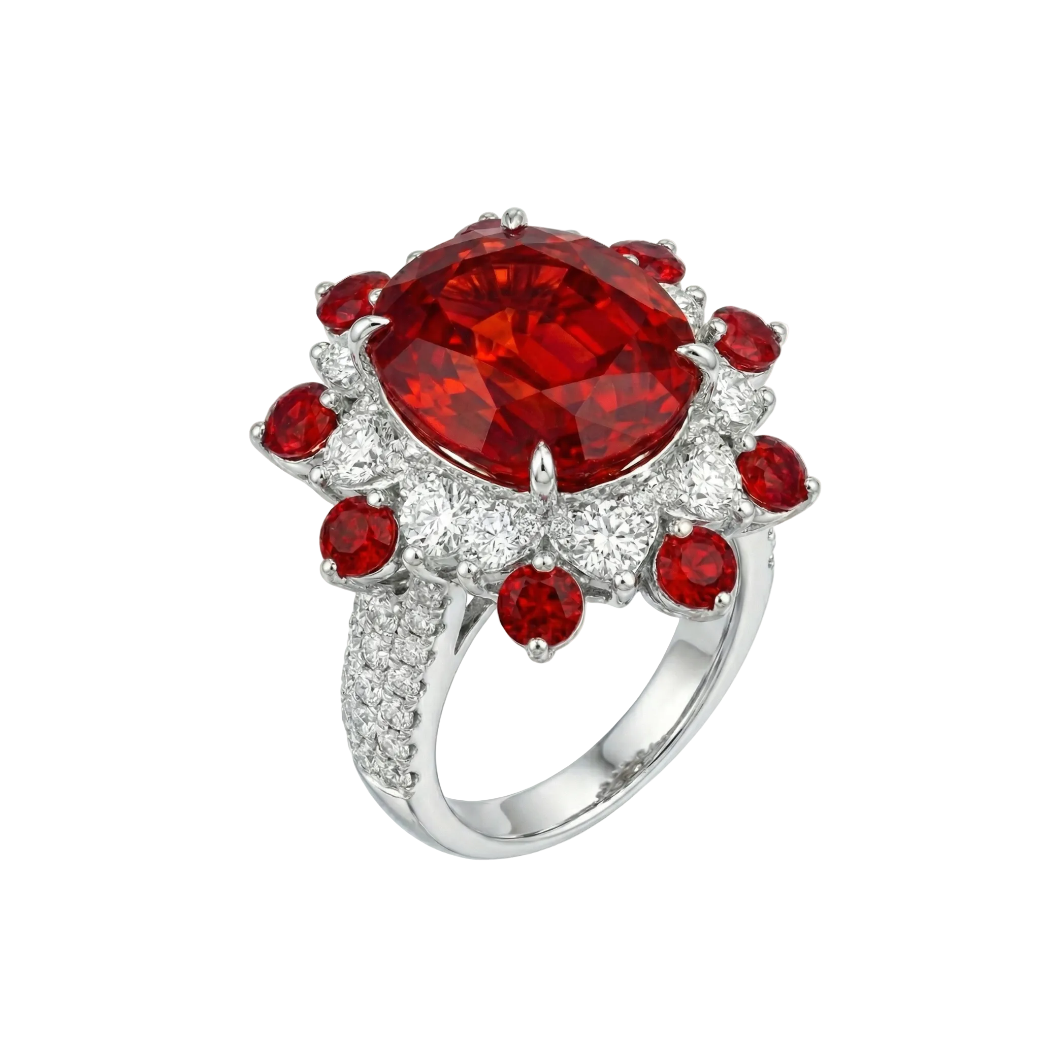 The Absolute Passion ring showcases a spectacular 7.68 carat spinel, precious stone of the highest tier, possessing a rare and commanding red brilliance at its core.
