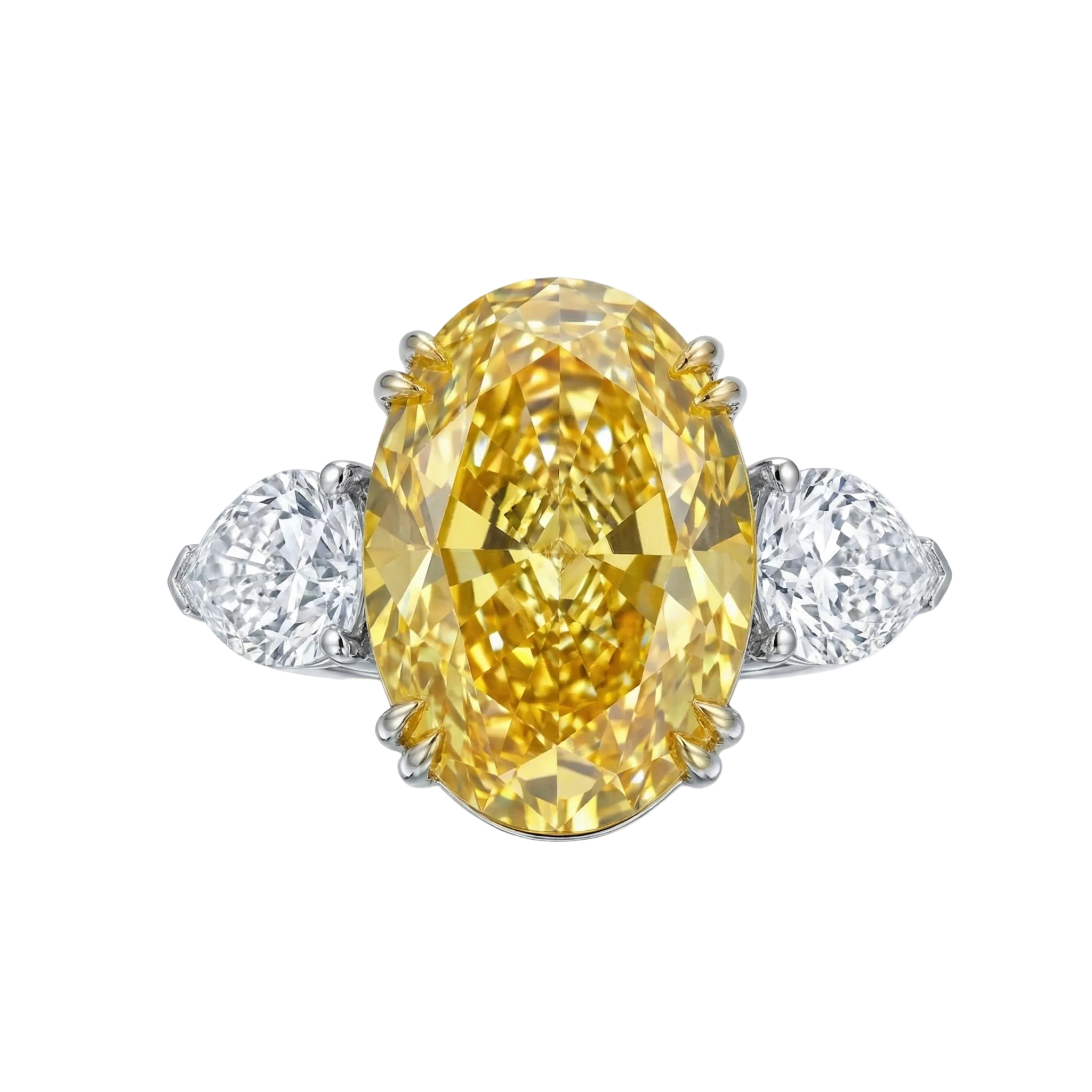 The Adrenaline ring features a magnificent oval yellow diamond, flanked by two brilliant pear-shaped side stones in a pristine platinum setting.