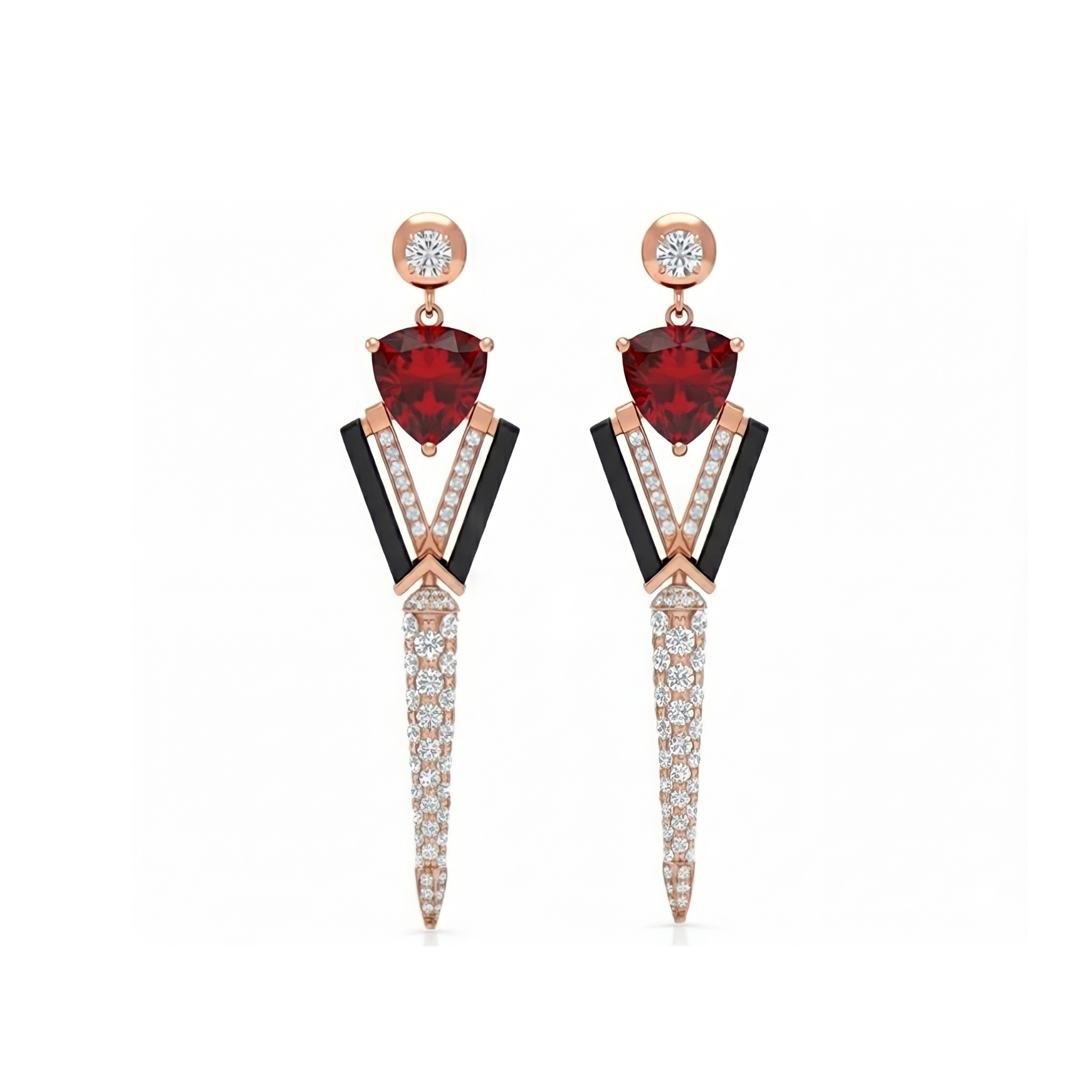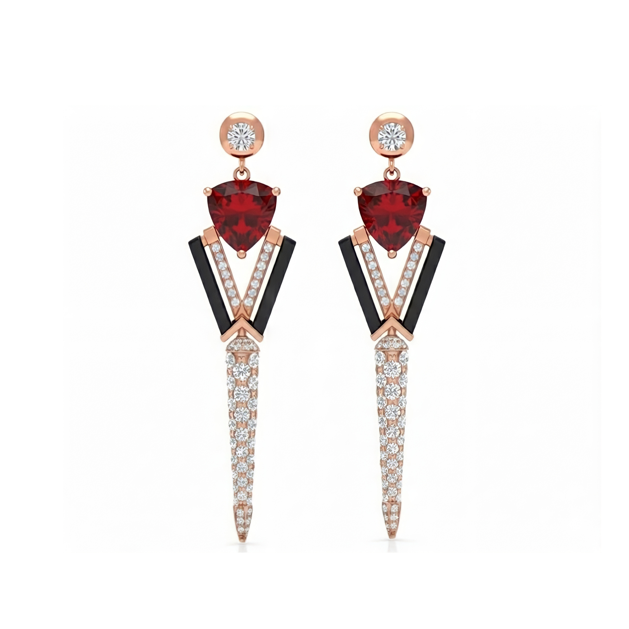 The daring architecture of these earrings is your personal manifesto of power and independence, captured in sharp edges and the warm glow of rose gold. The fiery red spinel clashes with the dazzling trail of white diamonds, creating a striking and defiant visual explosion. This artifact jewelry is designed to dominate the space, emphasizing your individuality loudly and without compromise.