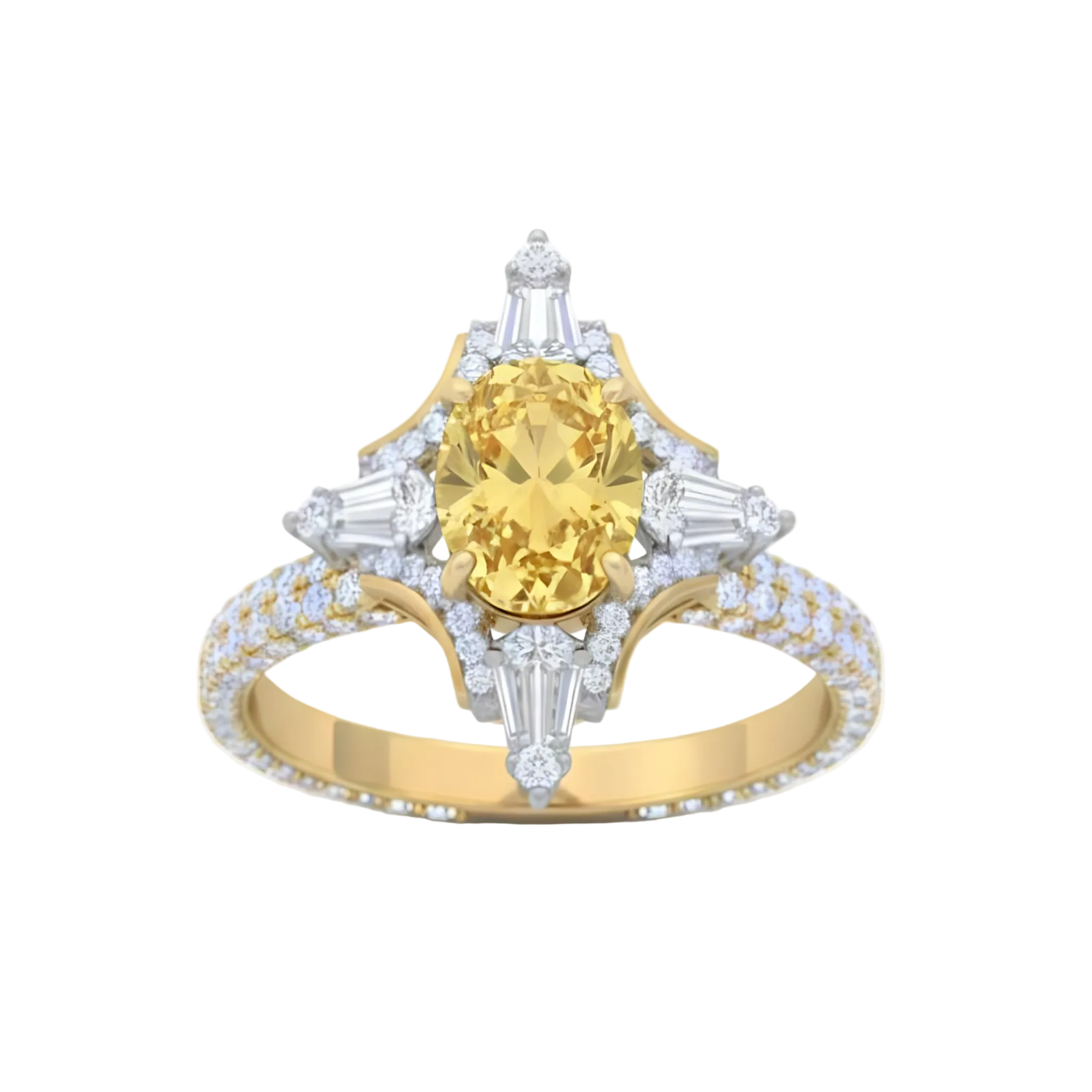 The central stone, embraced by a luxurious multi-layered halo, creates an architectural silhouette filled with dazzling light.