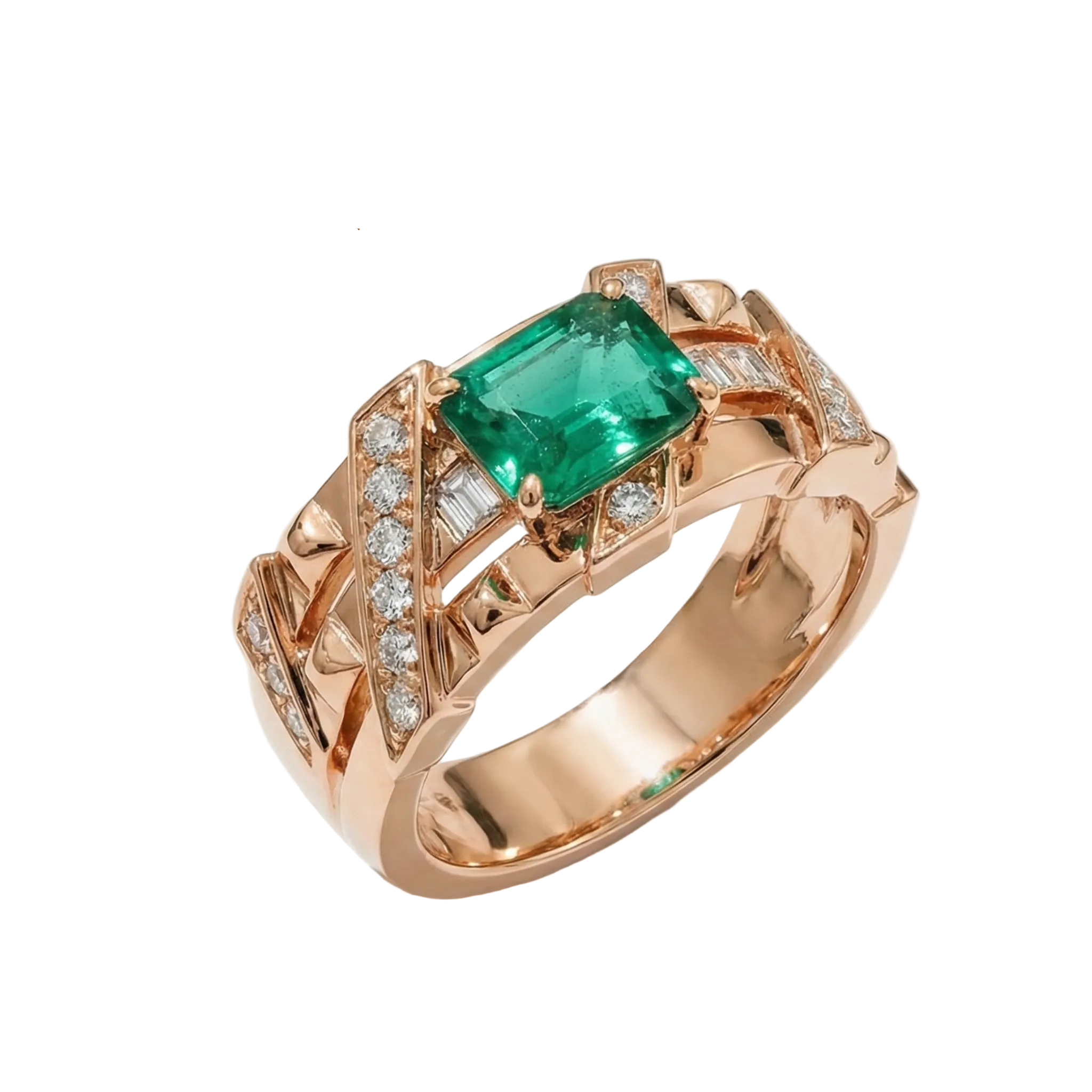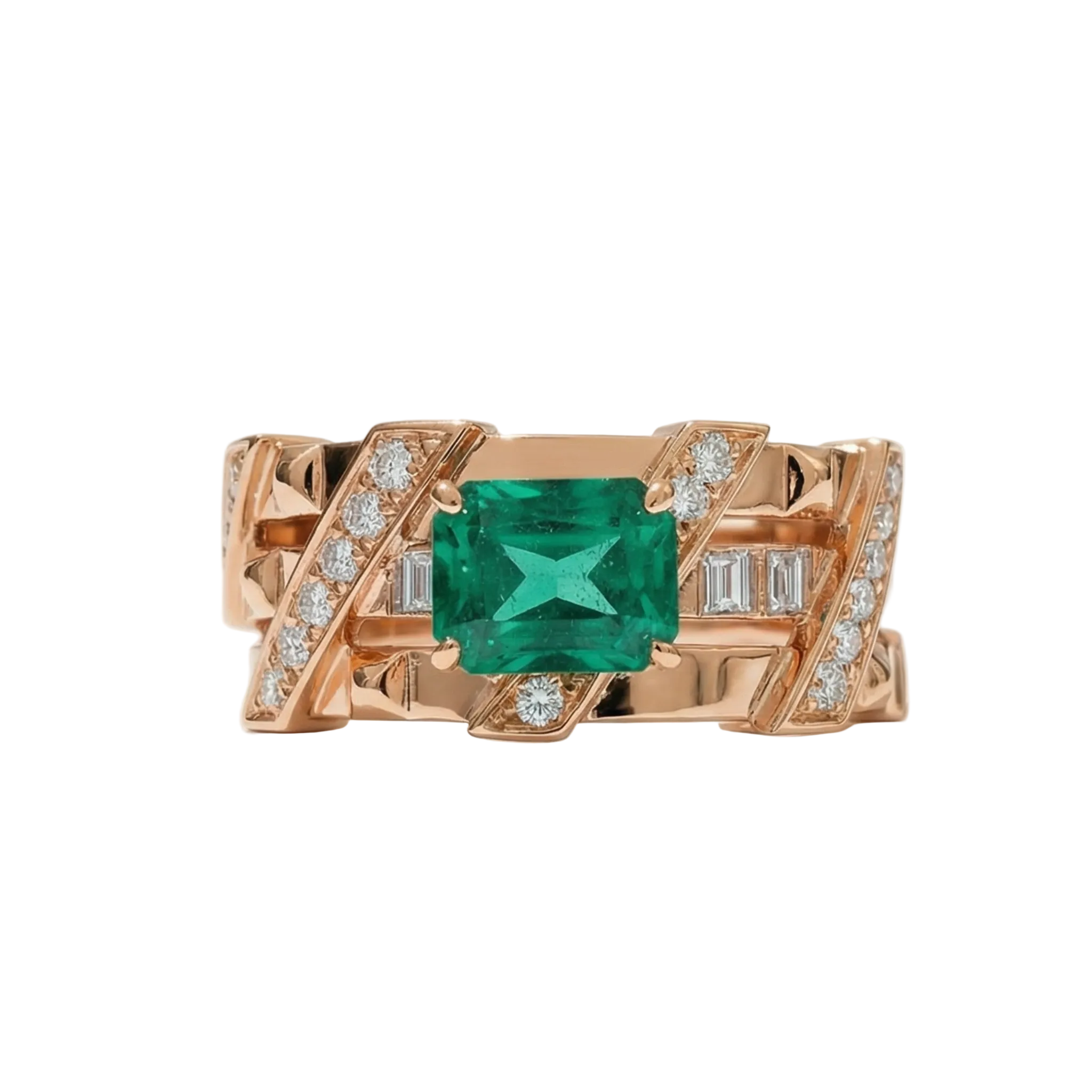 The dramatic contrast between the deep green emerald and the fiery metal accentuates the multi-level architectonics of the ring, adding a layer of refined luxury to its structure.