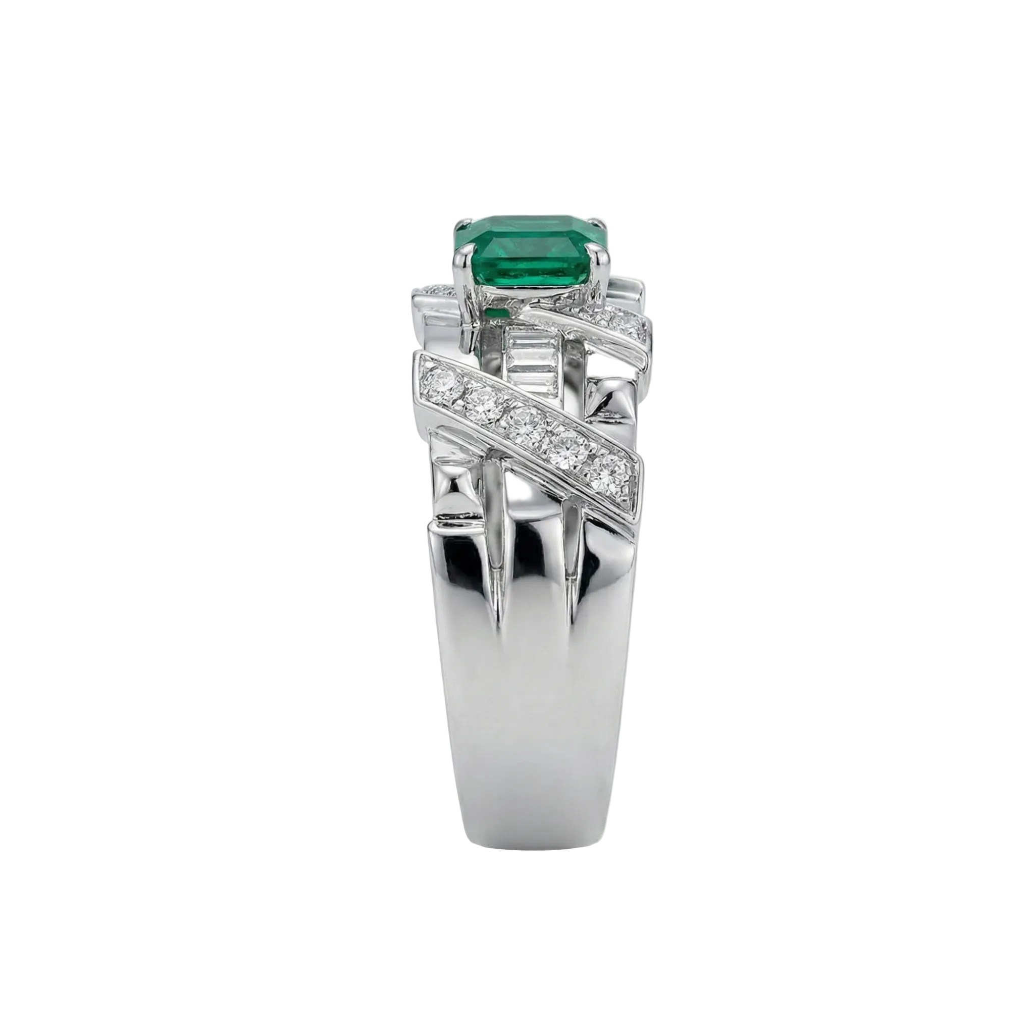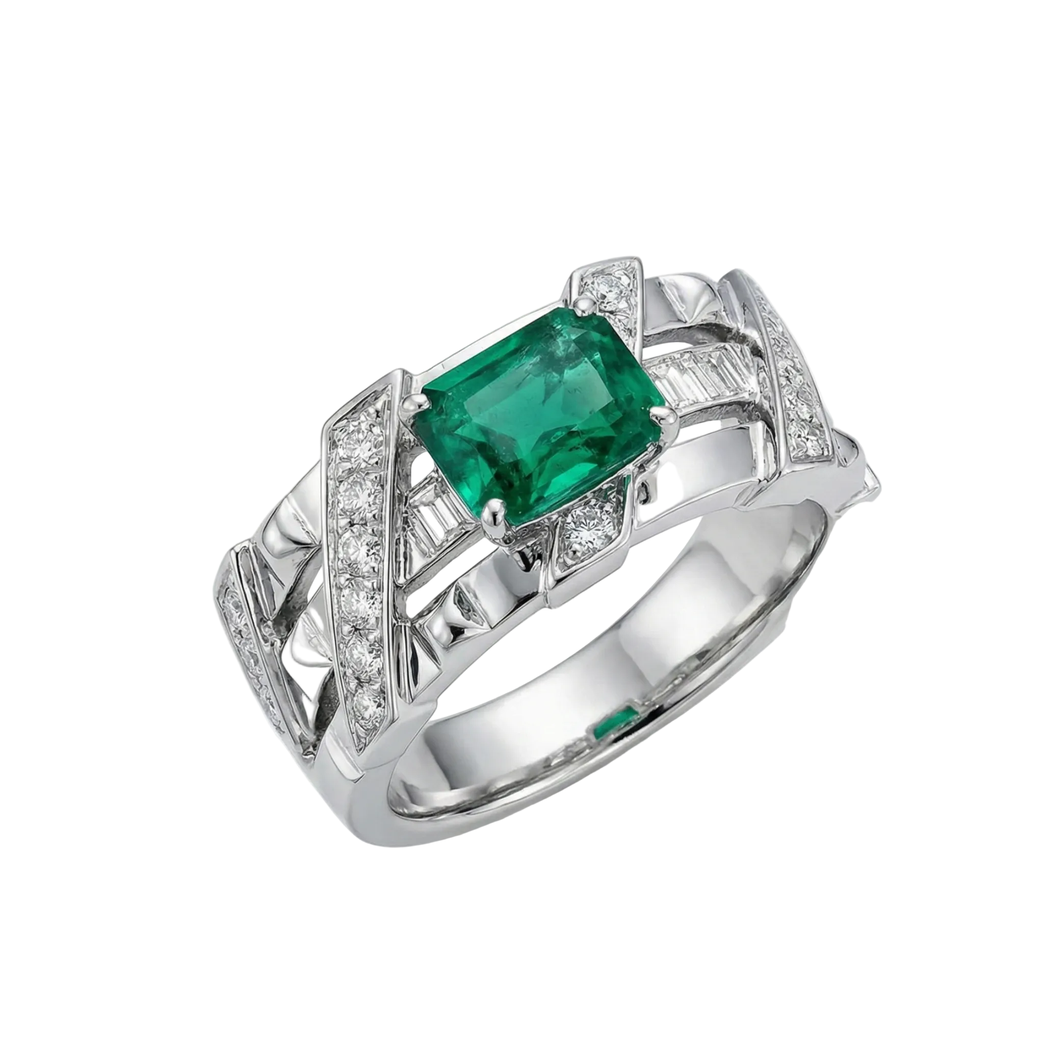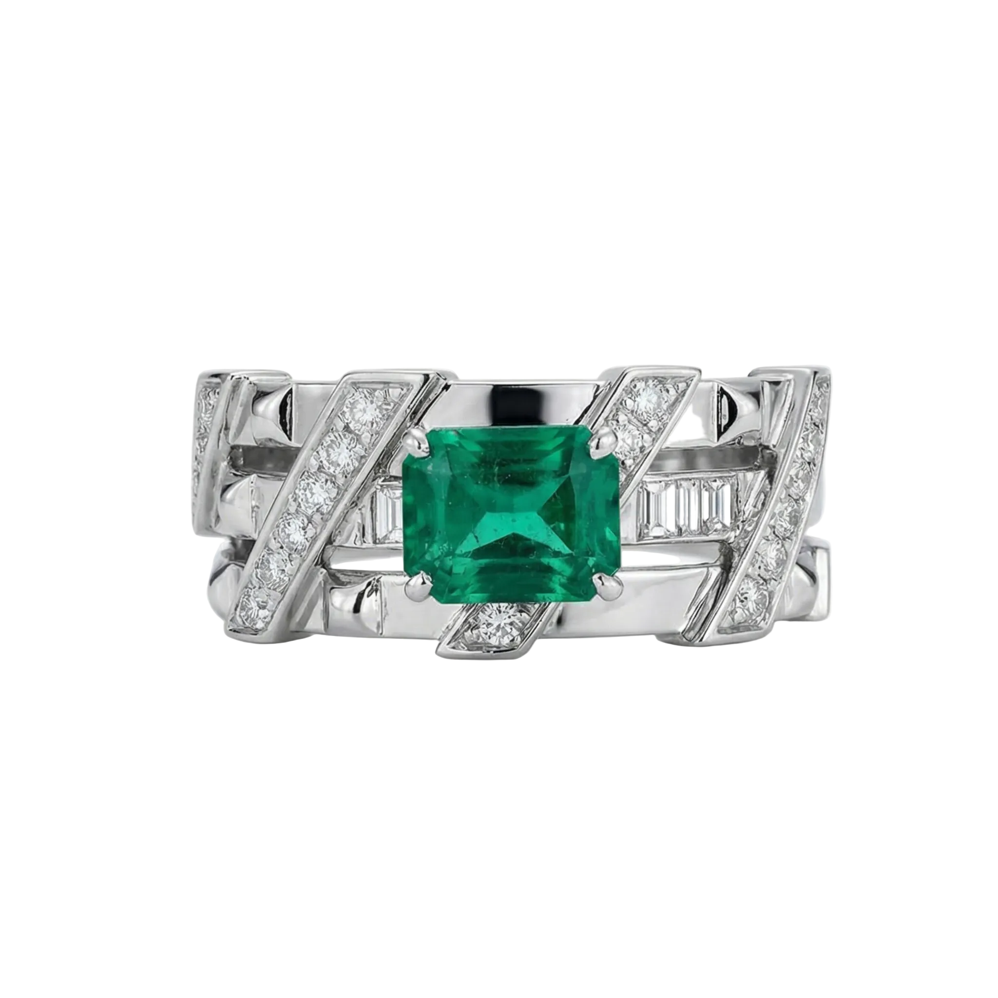 At its core, a vibrant emerald is secured within a complex lattice of metal "beams" and baguette diamonds, showcasing a design of uncompromising engineering precision.