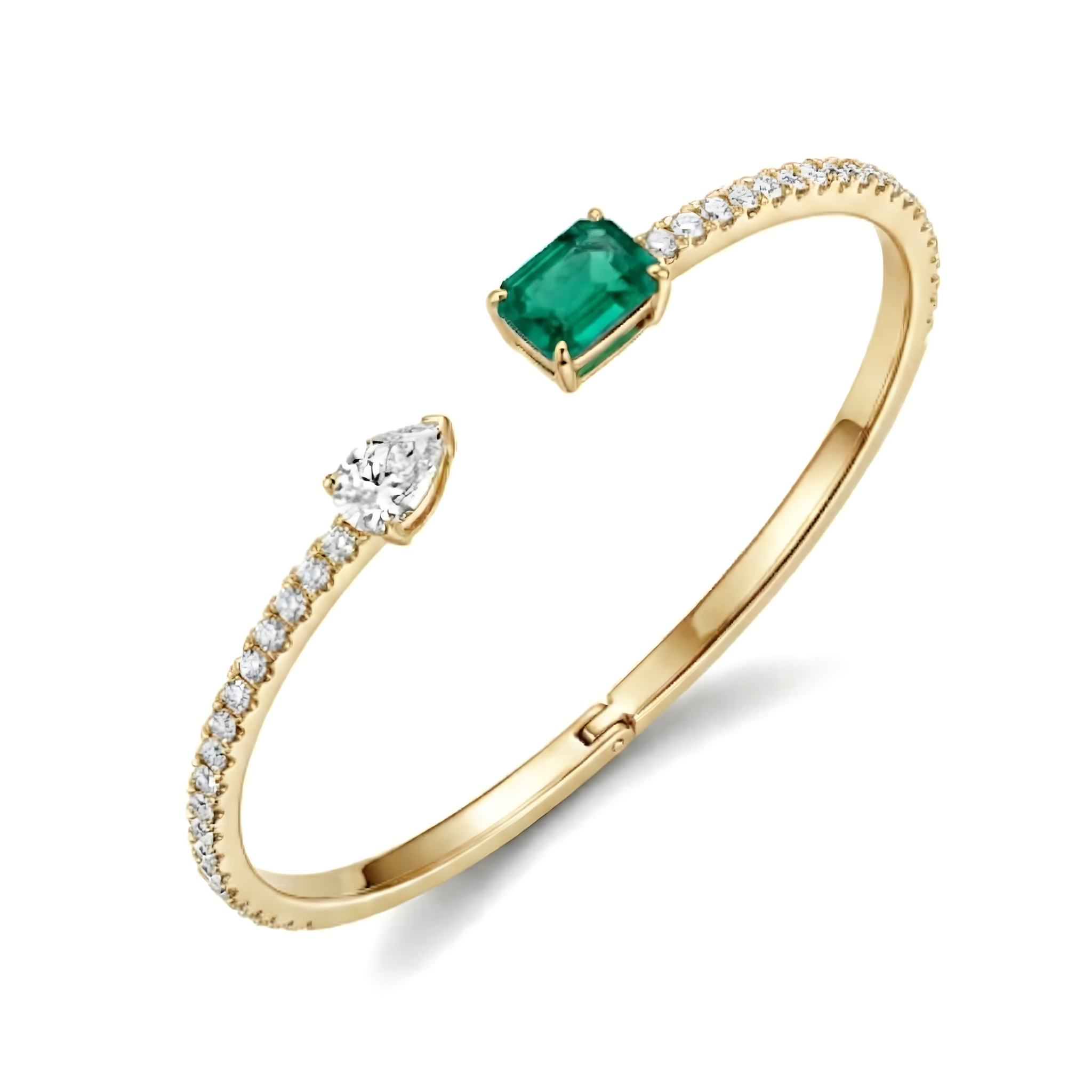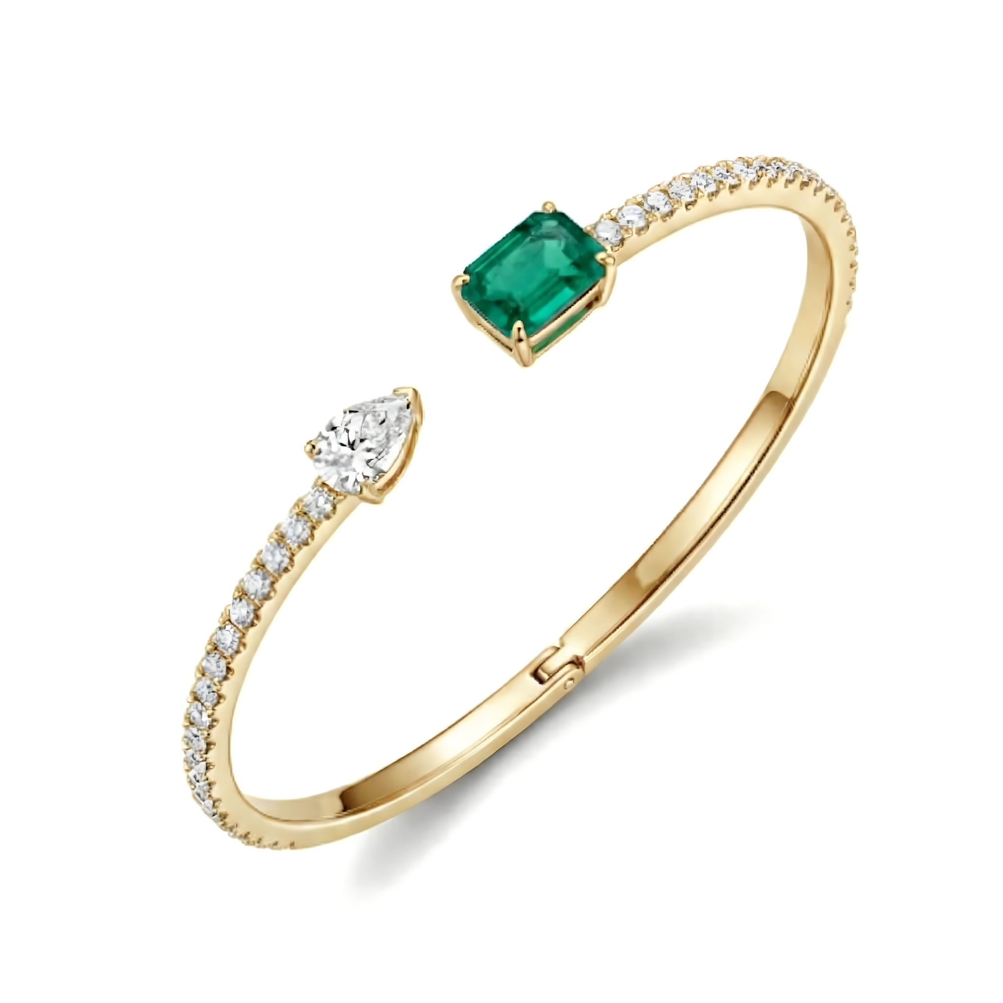 A high-grade 0.7-carat natural emerald and a 0.3-carat pear-cut diamond take center stage, offering a striking contrast between vibrant color and crystalline clarity.