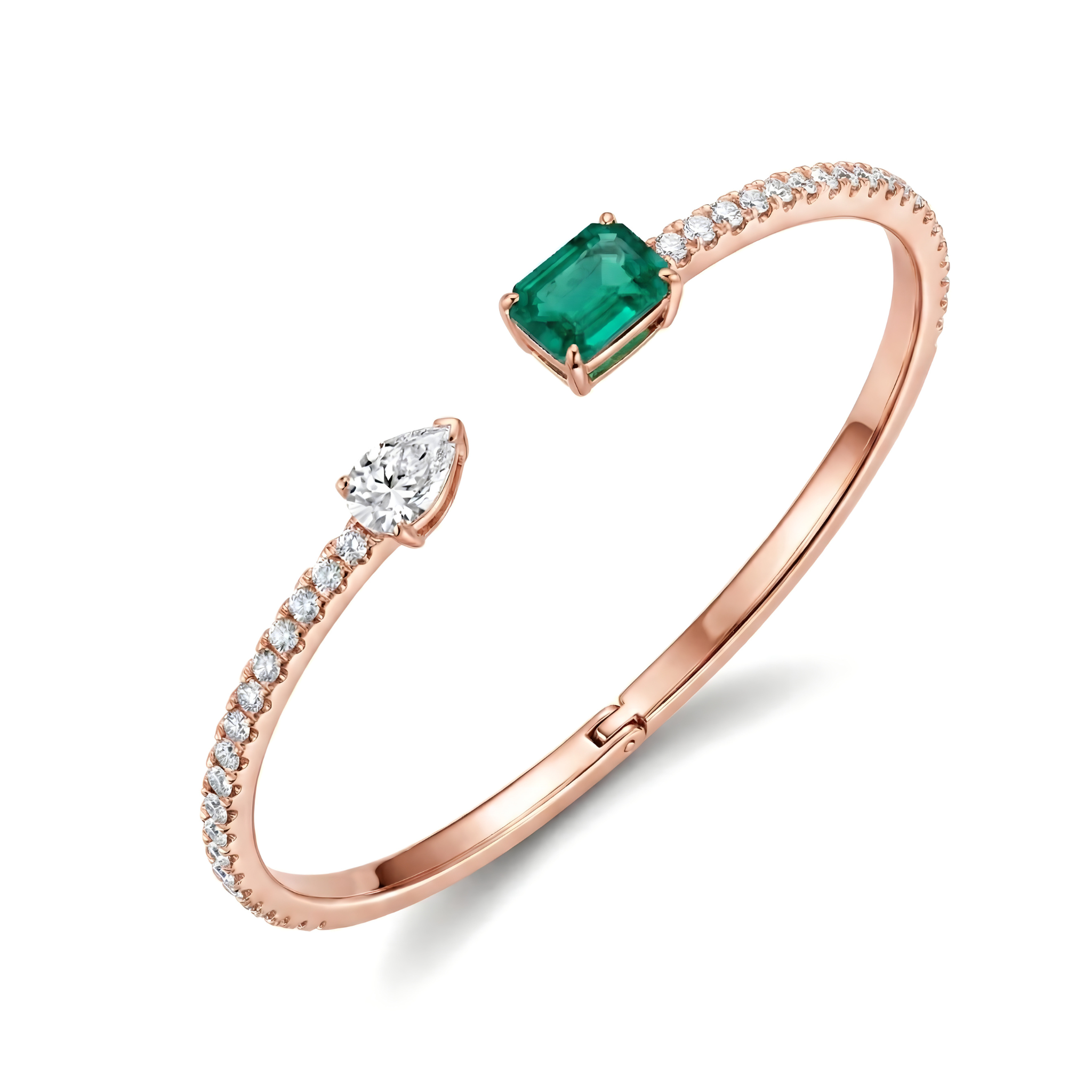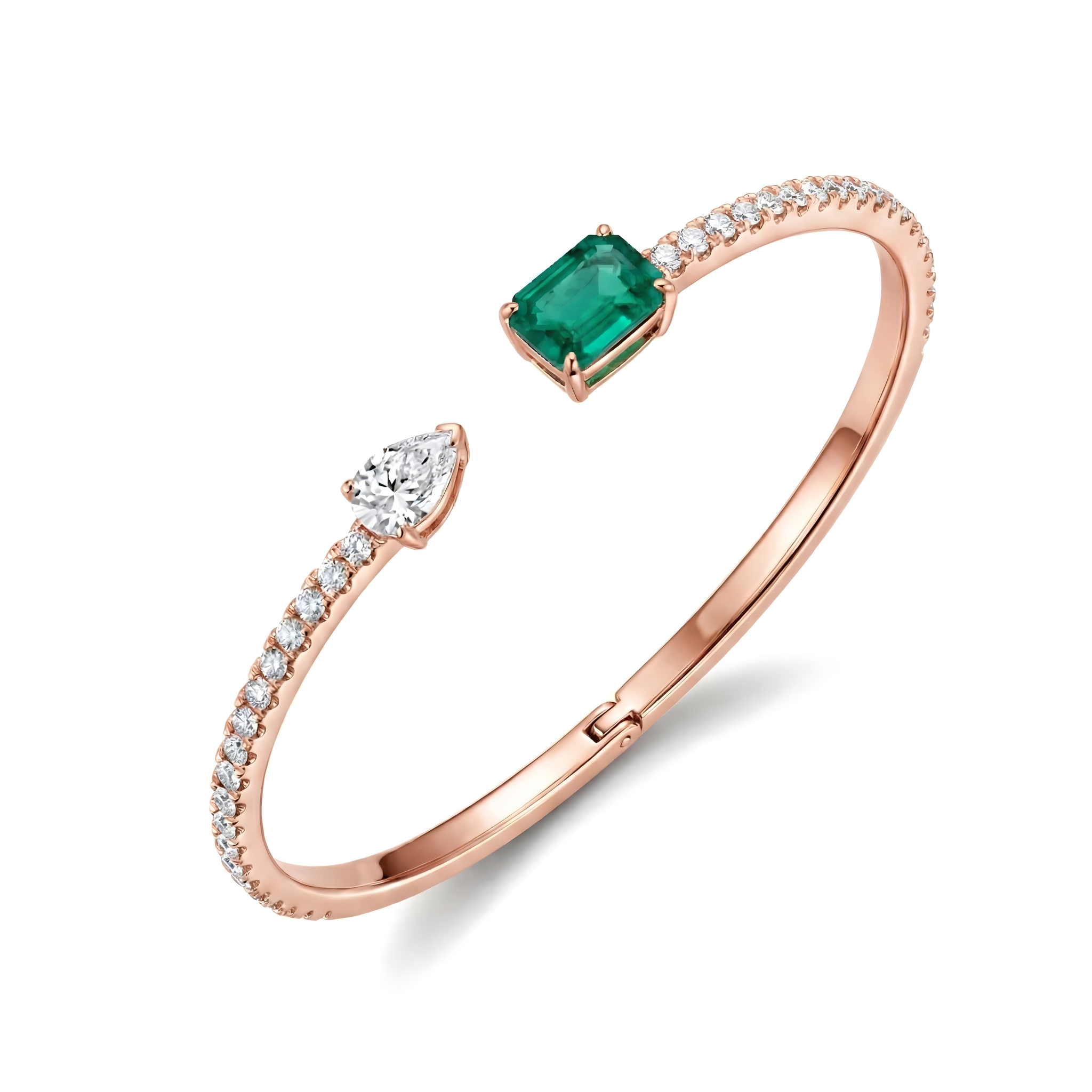 The Privé Status Quo bracelet in rose gold is a refined "Toi et Moi" masterpiece. It features a striking duo: a deep 0.7-carat high-grade emerald and a brilliant 0.3-carat pear-cut diamond.