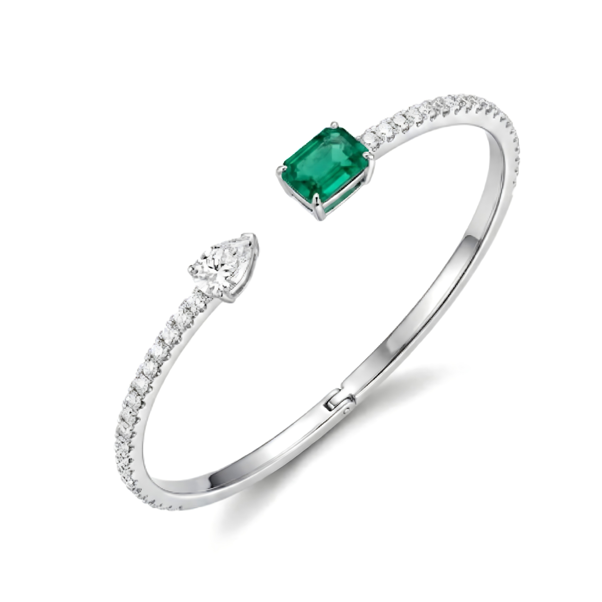 A high-grade 0.7-carat natural emerald and a 0.3-carat pear-cut diamond take center stage, offering a striking contrast between vibrant color and crystalline clarity.
