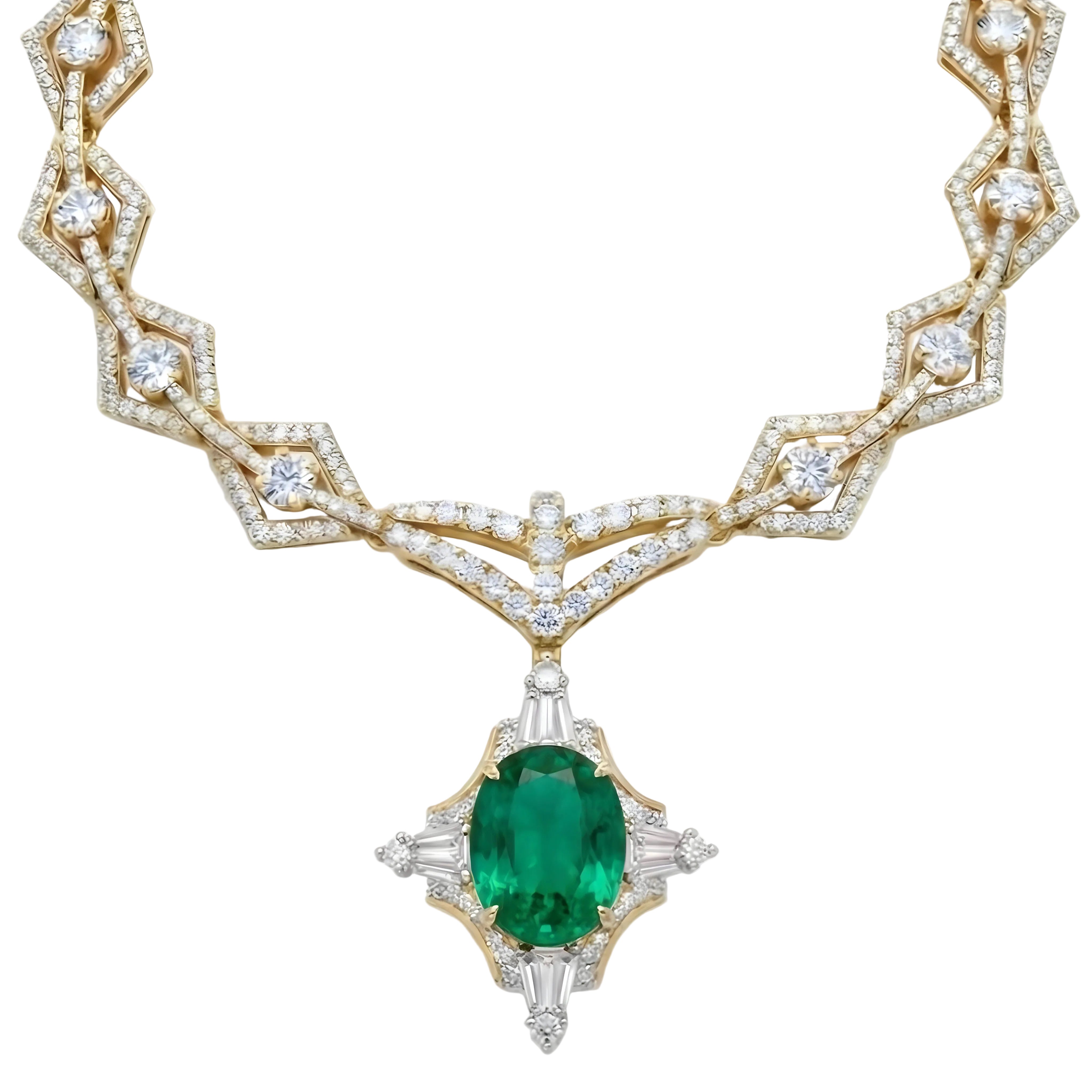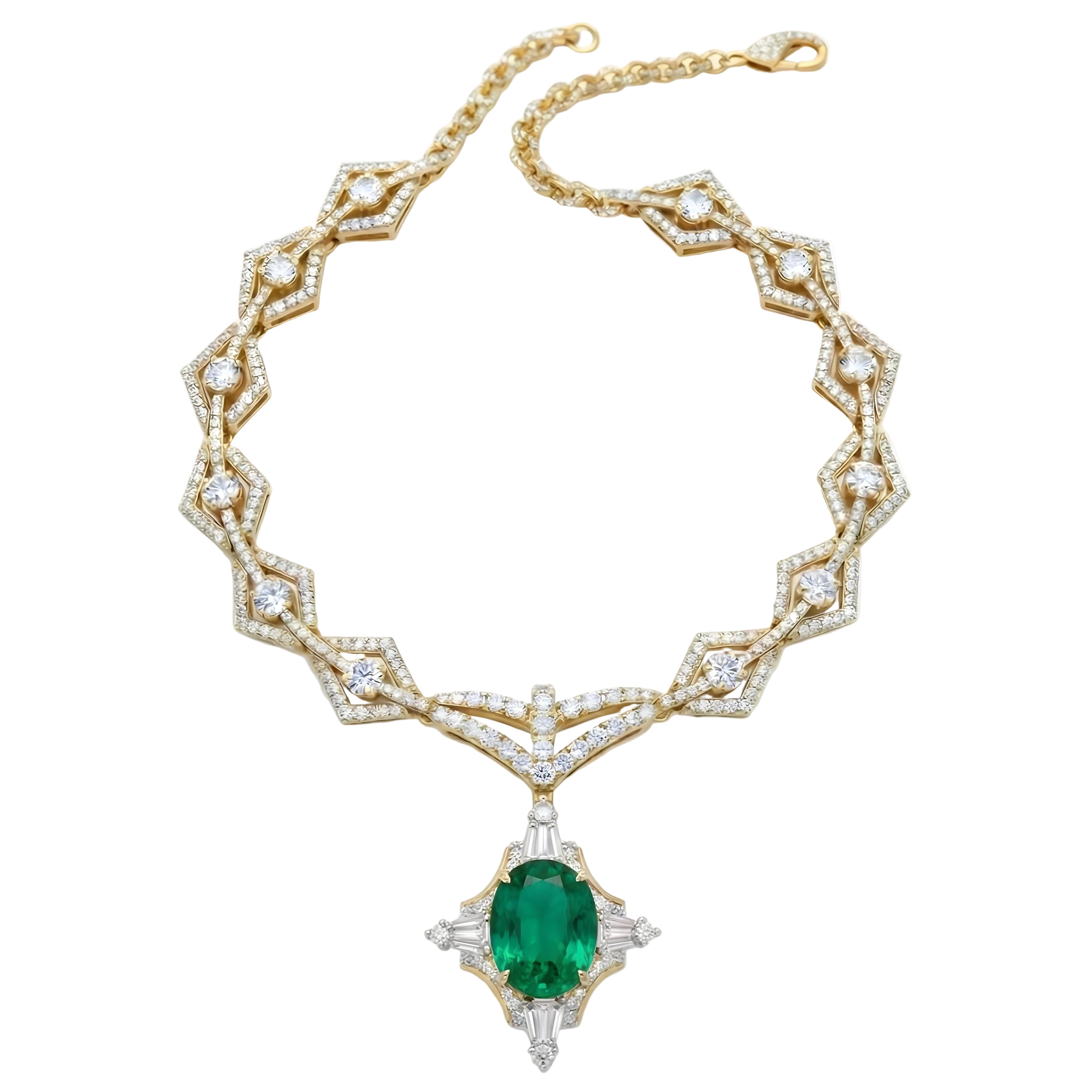 A breathtaking central Colombian emerald commands the viewer’s attention, encased within a complex geometric lattice of white diamonds.