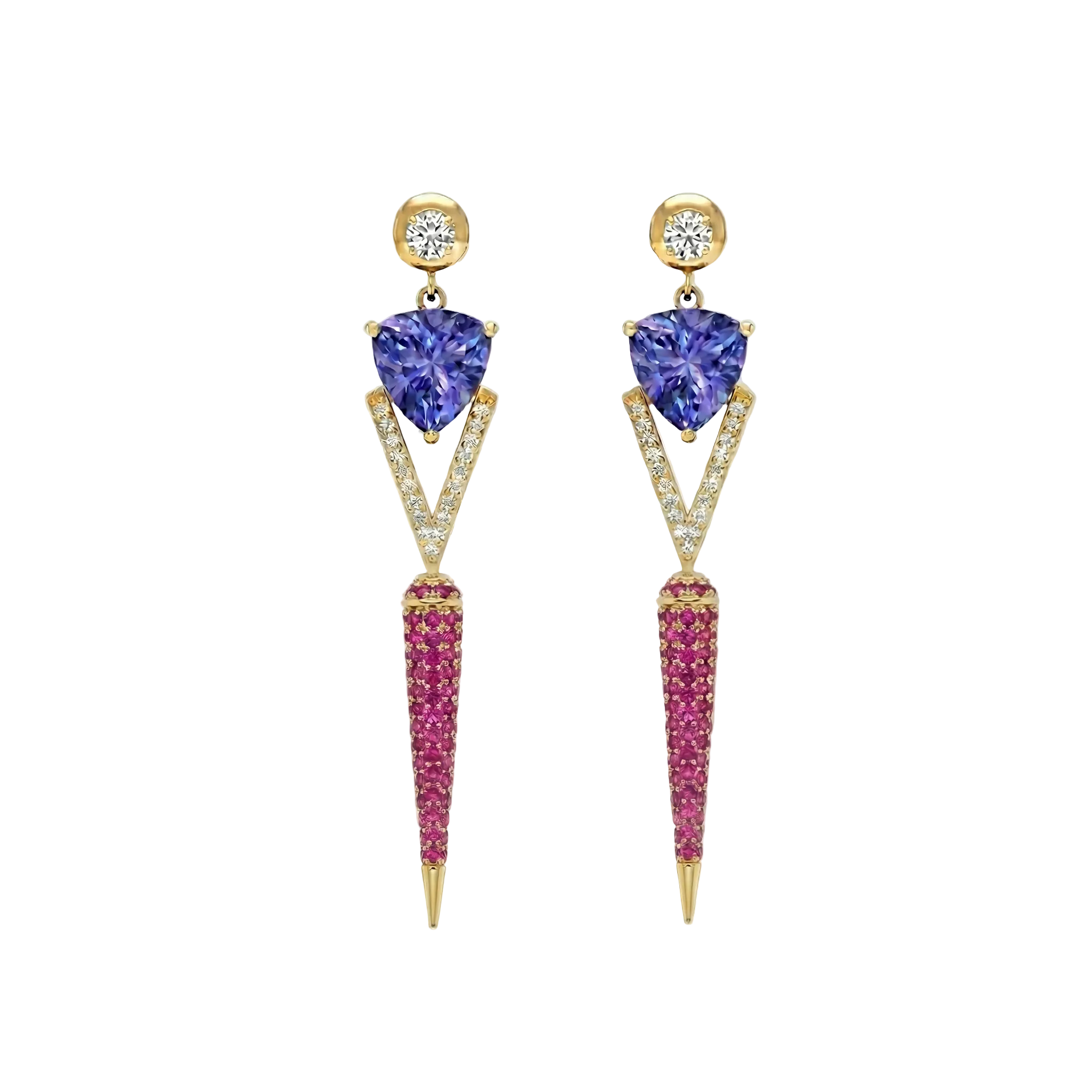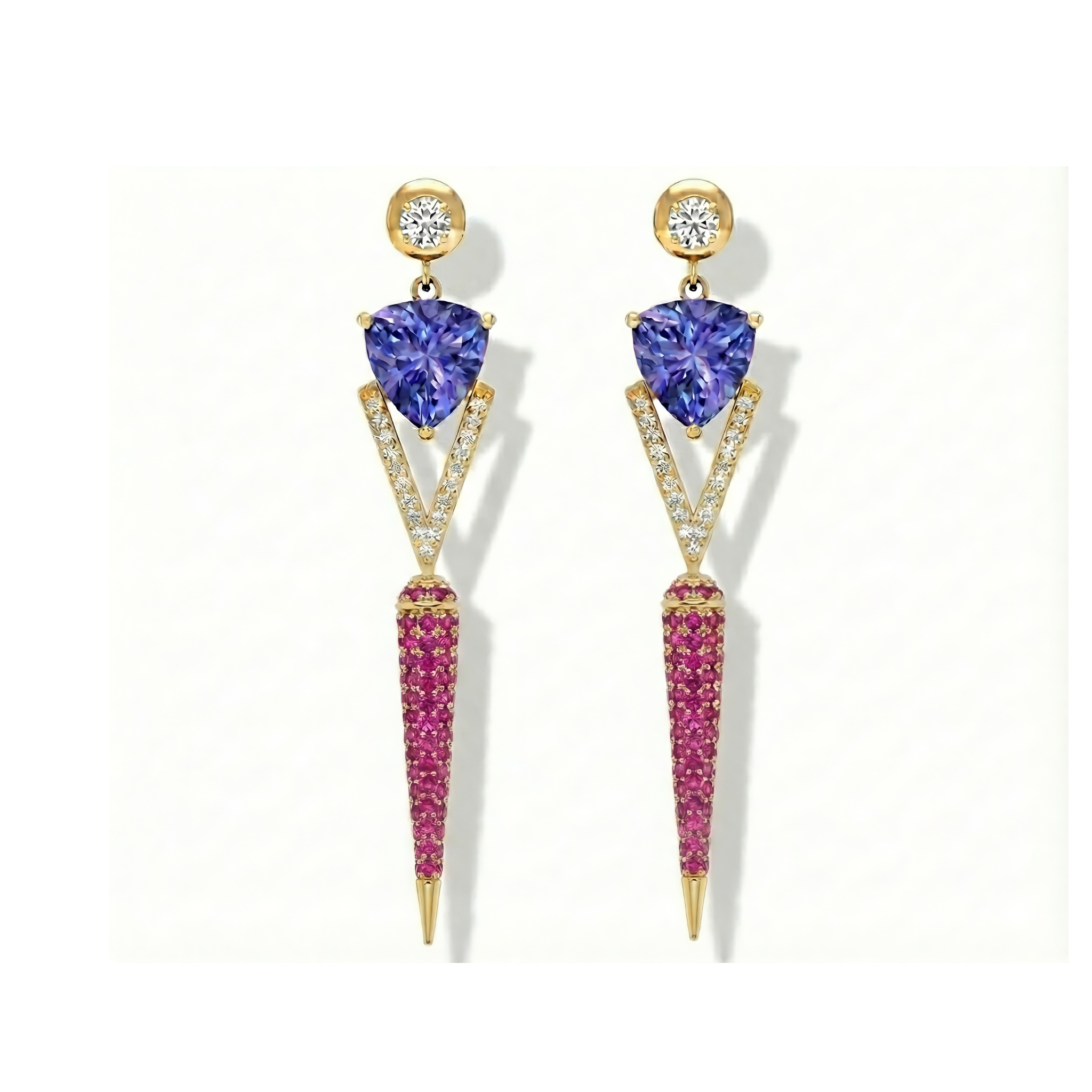 The sharp, drop-shaped silhouettes are meticulously pavé-set with vibrant red spinels and brilliant white diamonds, creating a striking contrast of fire and ice.