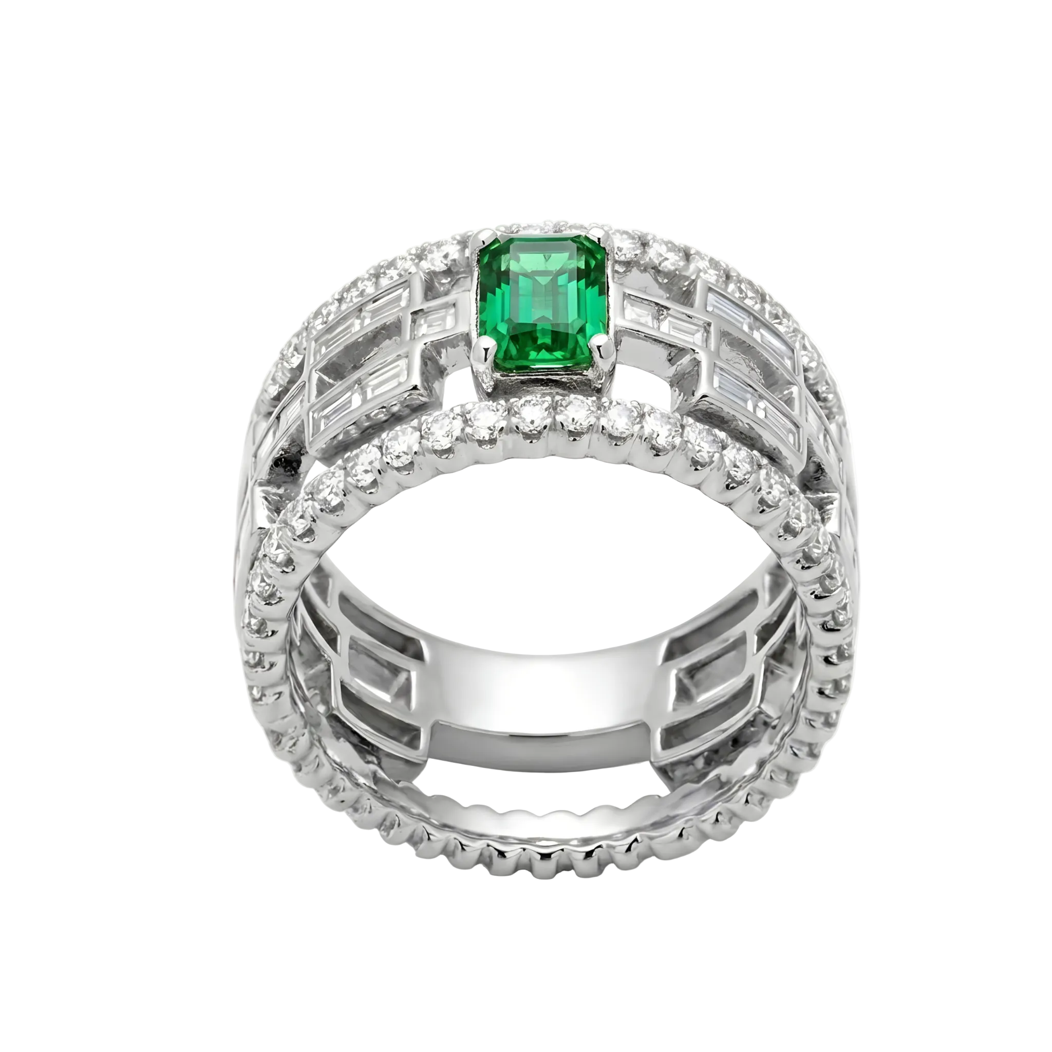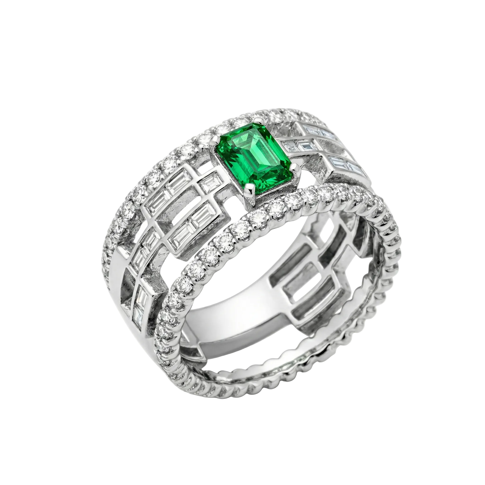 The complex, multi-level structure of the band, set with baguette diamonds, resembles the power framework of a futuristic skyscraper.