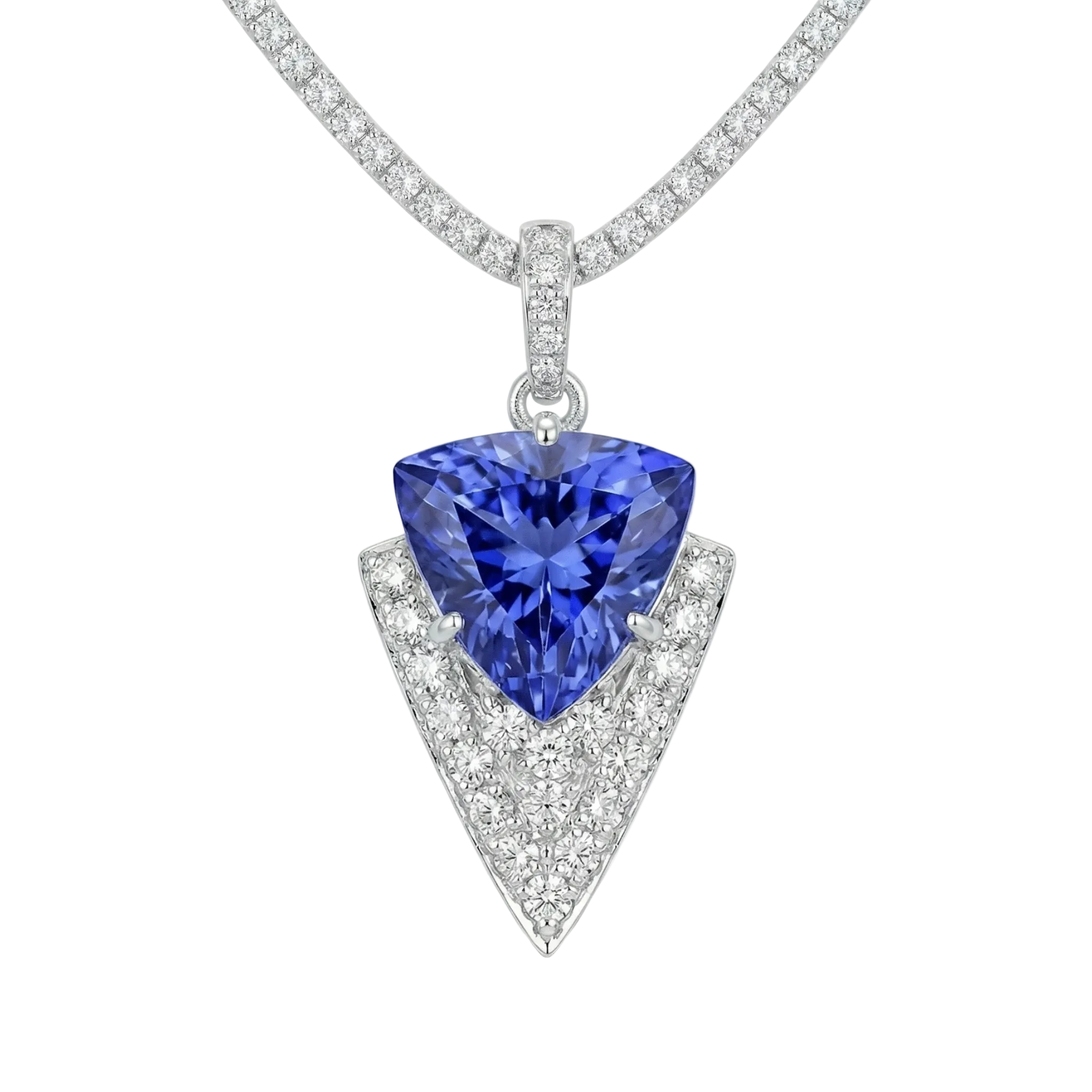 Crafted in noble platinum, the necklace showcases a mesmerizing deep blue Tanzanite 6.5 carat in a trillion cut, radiating a unique violet-blue brilliance.