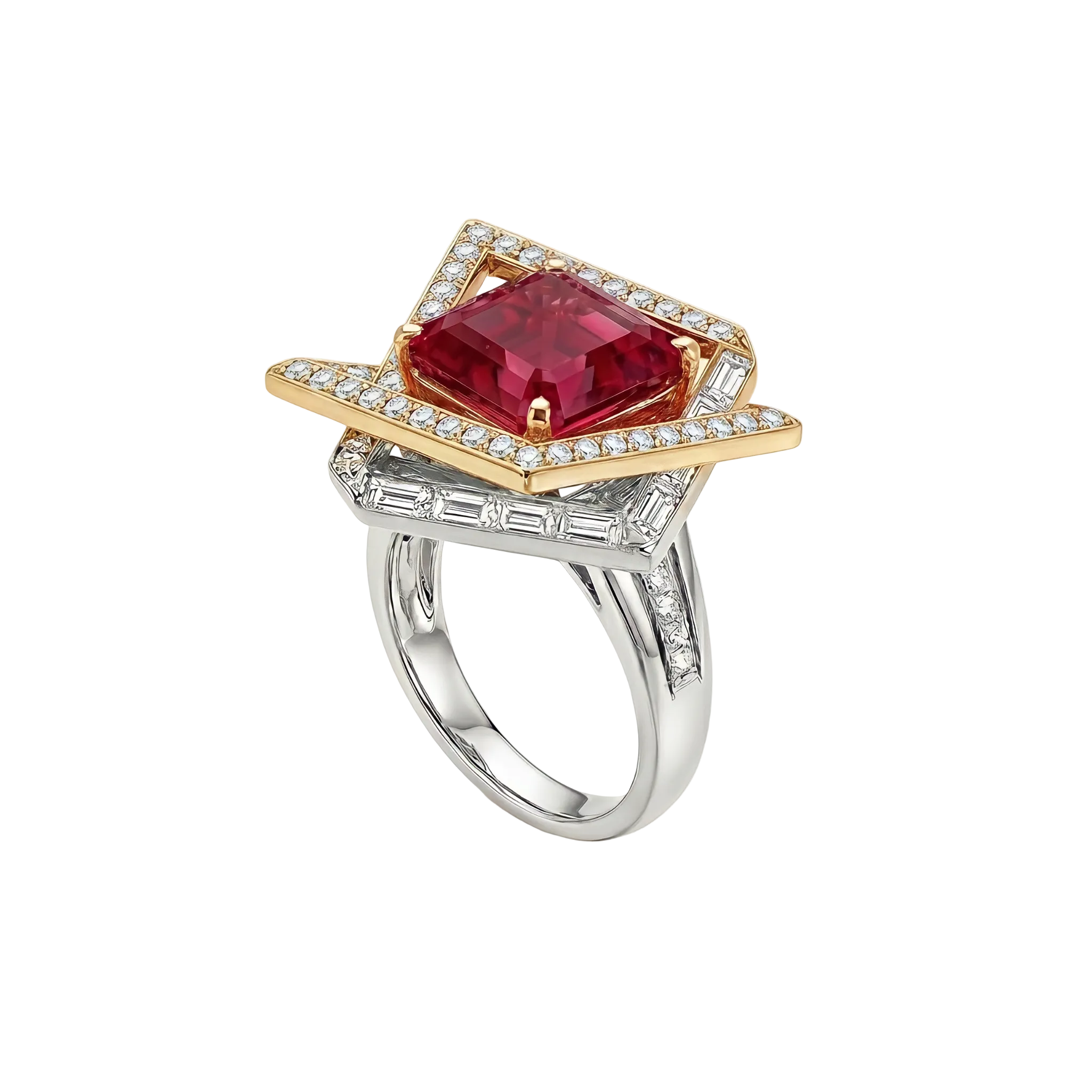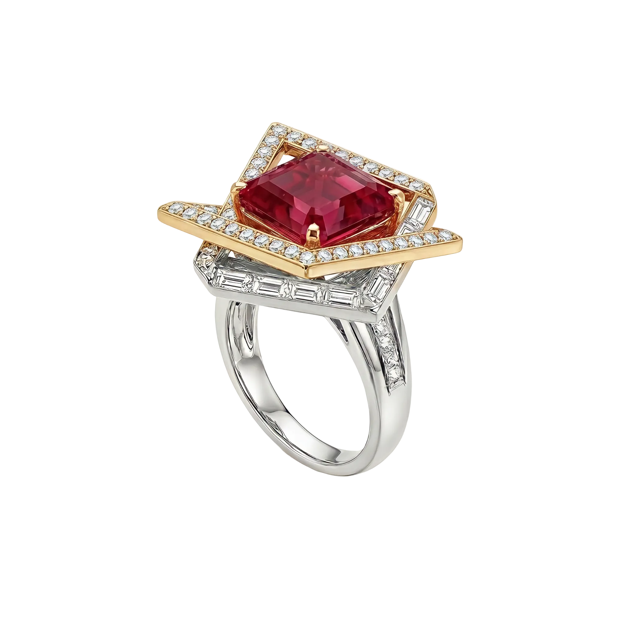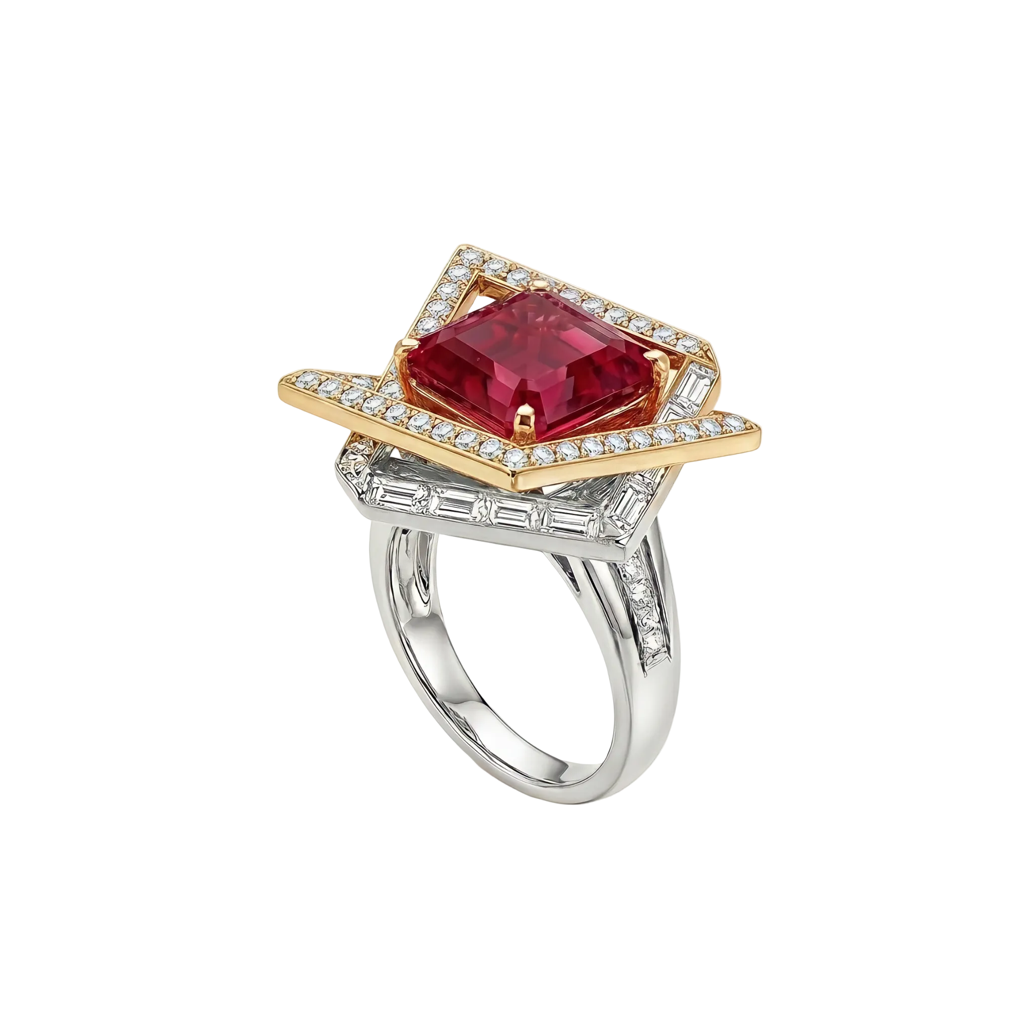 This conceptual ring, crafted from a striking combination of noble platinum and radiant yellow gold, represents a triumph of modern geometry.