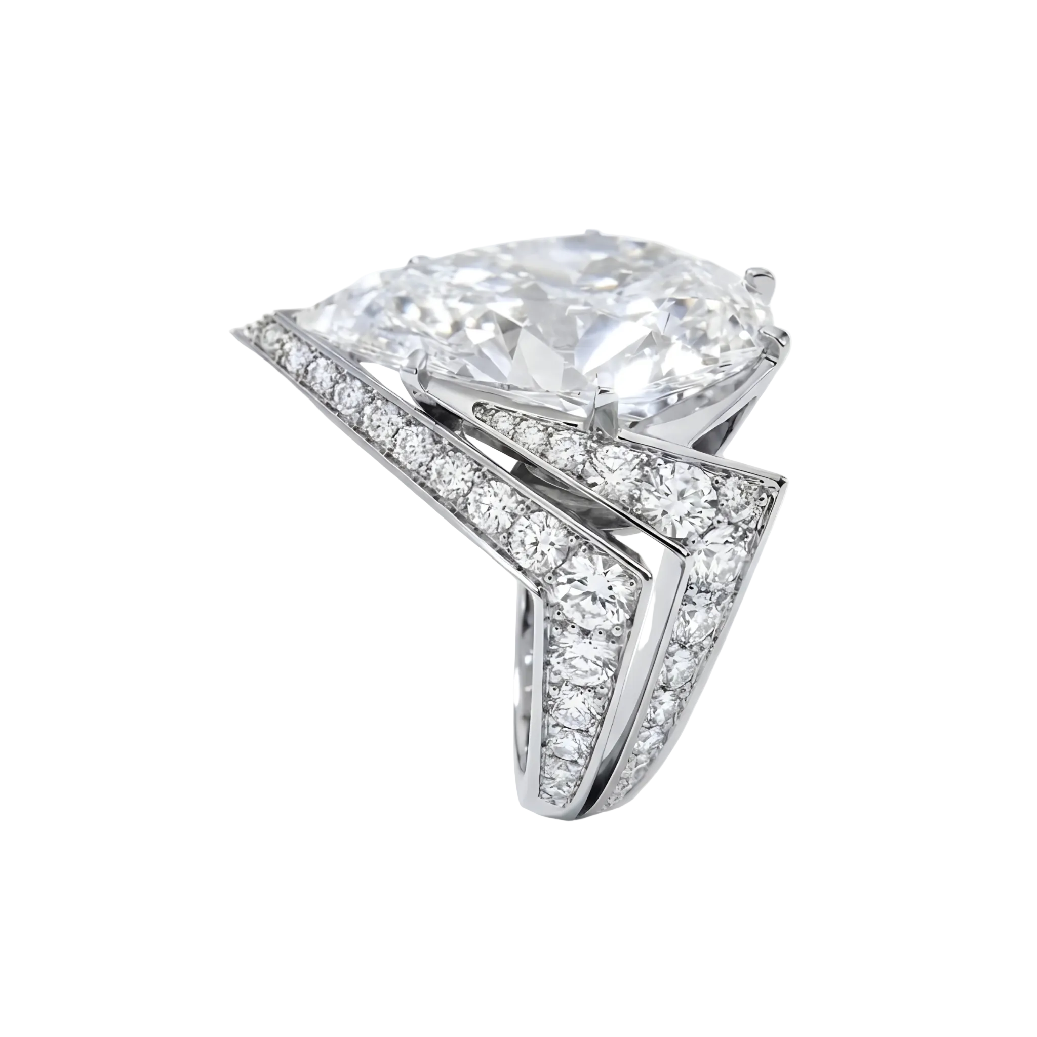 The architectural design is entirely embellished with a dense pavé of brilliant natural white diamonds, creating a seamless flow of incomparable light. A true statement of regal luxury, this piece combines avant-garde form with the timeless prestige of superior gemstones.