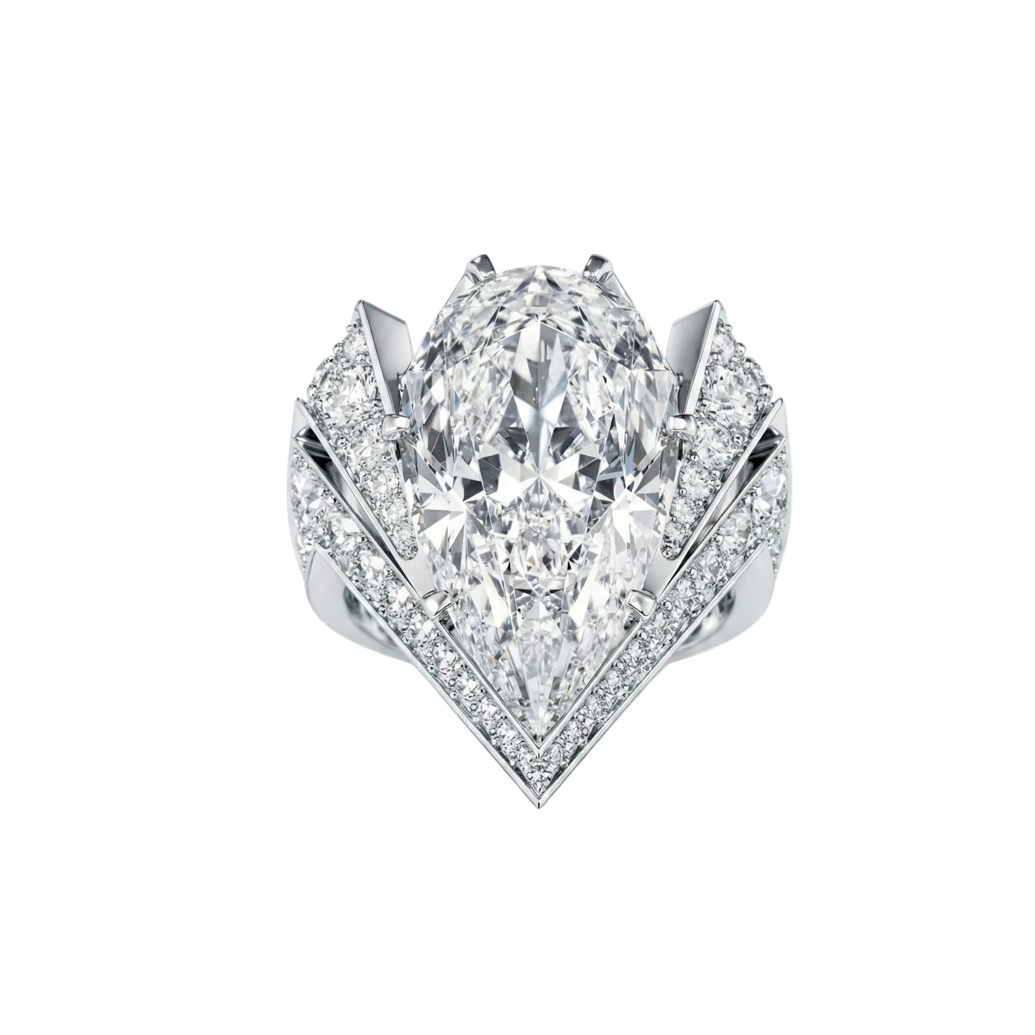 This majestic ring is masterfully forged in pure platinum, featuring a breathtaking natural pear-shaped diamond as its crowning centerpiece.